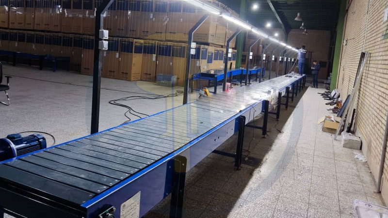 3. سیستم حرکت (Drive System): سیستم حرکت مسئول ایجاد حرکت در اسلت کانوایر است. این سیستم میتواند شامل موتورها، زنجیرهها، دستهها یا نوارهای نقاله باشد. با فعال شدن سیستم حرکت، رولرها به حرکت در میآیند و کالاها را در طول ریلها جابجا میکنند.